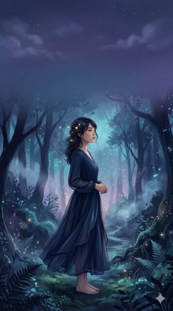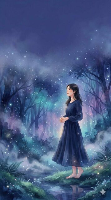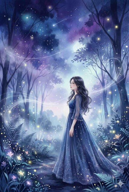 本の表紙用メインビジュアル。20代くらいの女性が静かに立っている。少し横を向き、視線は遠くを見ている。背景は夜の森を思わせる抽象的な空間で、青と紫を基調にした幻想的な雰囲気。霧や光の粒が少し漂い、静かで少しミステリアスな印象。写真そのままではなく、小説の装画のような上品で繊細なタッチ。怖すぎず、美しさと余韻を重視する。表紙タイトルを上部に置けるよう、上側に余白を残す。縦長の表紙比率。高精細。